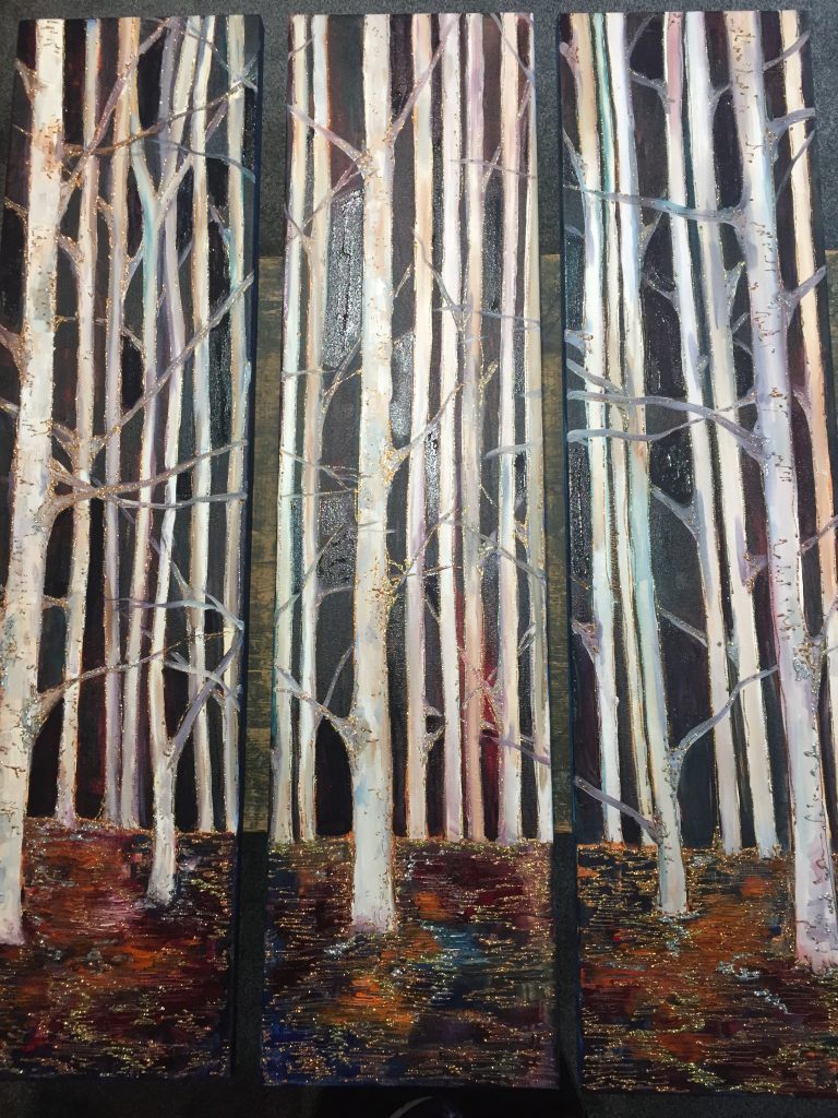 Glitter Trees Oil and glitter on canvas 25cm x 100cm Triptych